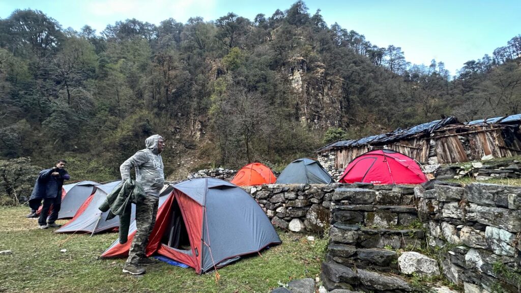 Next morning, after a hot breakfast, we drove 8 hours to Uttarkashi and another 2 hours to Agoda. Our group of 11 was a mix, with me as the oldest and a 23-year-old as the youngest. That afternoon we walked just 2 km to acclimatize. First night in tents.